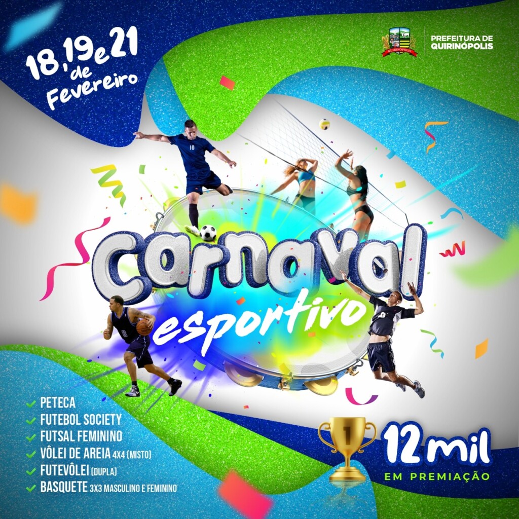 O Carnaval está chegando e, em Quirinópolis, as comemorações vão ser com Esporte para Todos. A Superintendência de Desporto e Lazer, preparou o Carnaval Esportivo, nos dias 18, 19 e 21 de fevereiro, com uma série de modalidades e competições em ritmo de folia para toda a torcida comemorar junto. Além disso, a premiação total será de R$12 mil reais. Todos os jogos serão realizados no Lago Sol Poente.