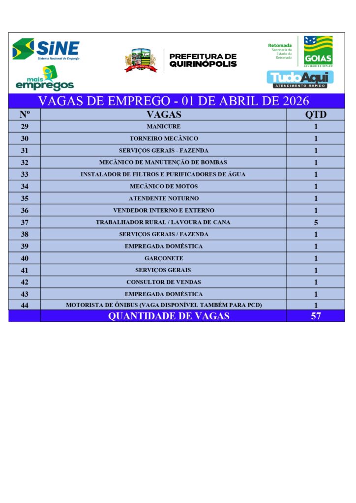Vagas De Emprego – 01/04/2026